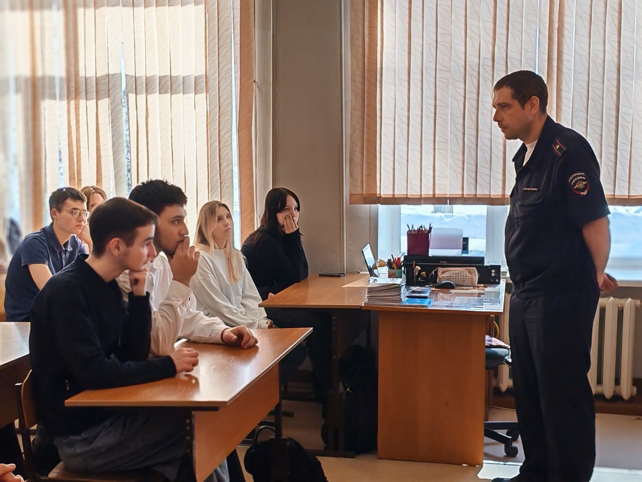 Перед старшеклассниками выступил заместитель начальника Госавтоинспекции Кемеровского муниципального округа. В серьезном разговоре он затронул важные для подростков темы: управление транспортом без прав, административная ответственность нарушителей и их родителей, а также безопасность на дороге и в быту.