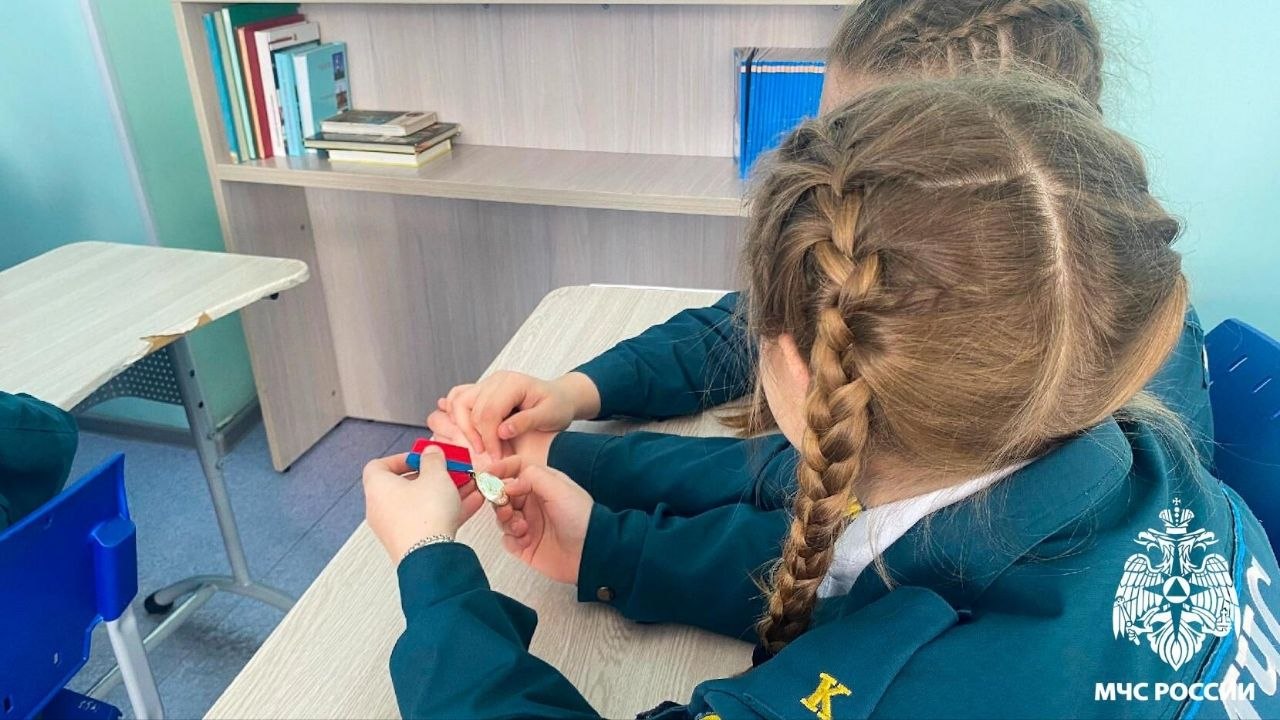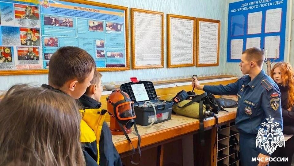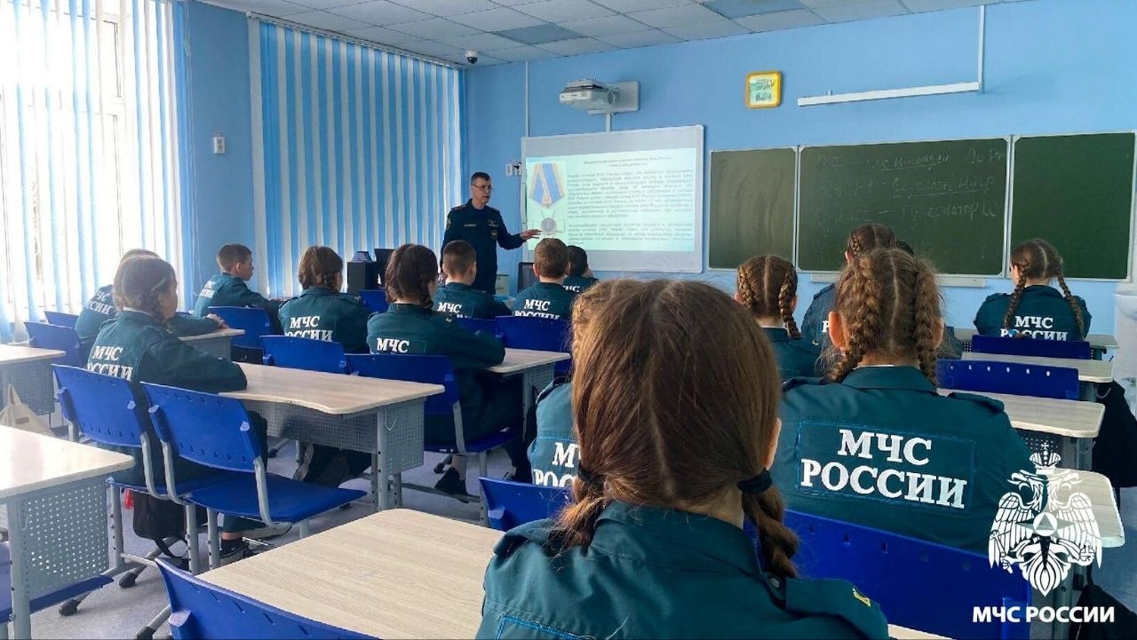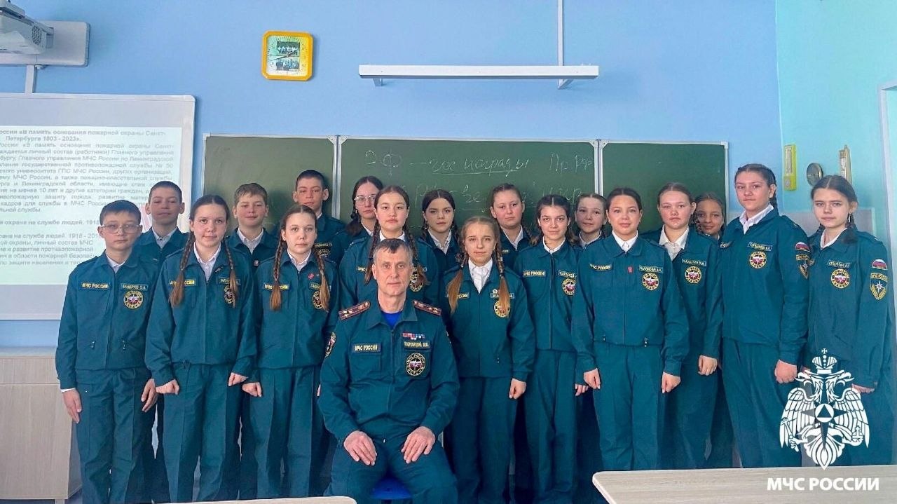 Ветеран пожарной охраны Анатолий Михайлович Бобровицкий провел профориентационное занятие для школьников, на котором рассказал о наградных знаках отличия и службе изнутри.