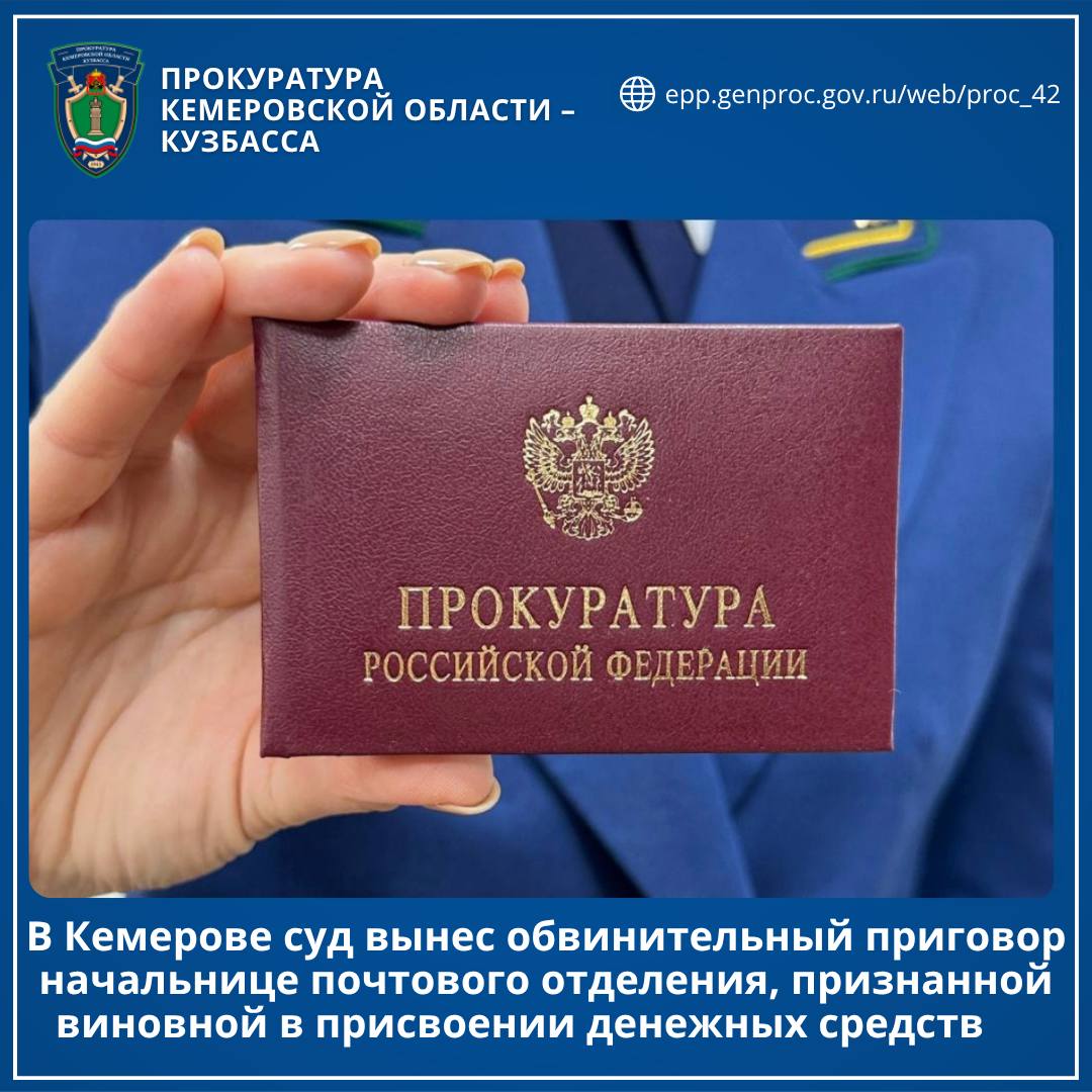 Кировский районный суд г. Кемерово вынес обвинительный приговор в отношении 40-летней начальницы отделения почтовой связи. Она признана виновной по ч. 3 ст. 160 УК РФ (присвоение).