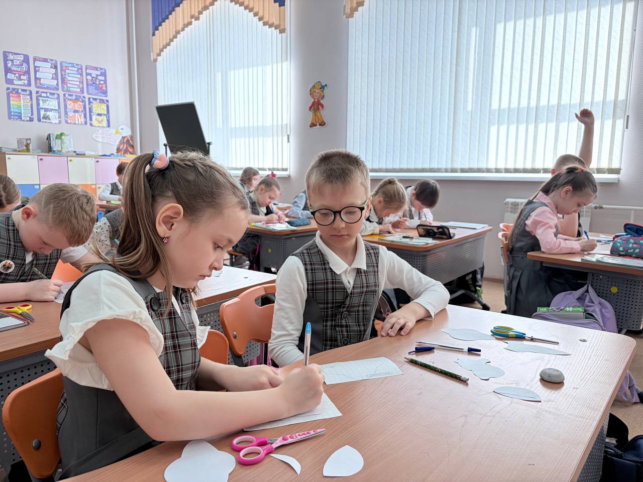 В ходе практической части занятия первоклассники под руководством полицейских создавали свои собственные «космические маячки». С помощью специальных трафаретов и световозвращающей бумаги дети мастерили наклейки в форме ракет, планет и звезд.