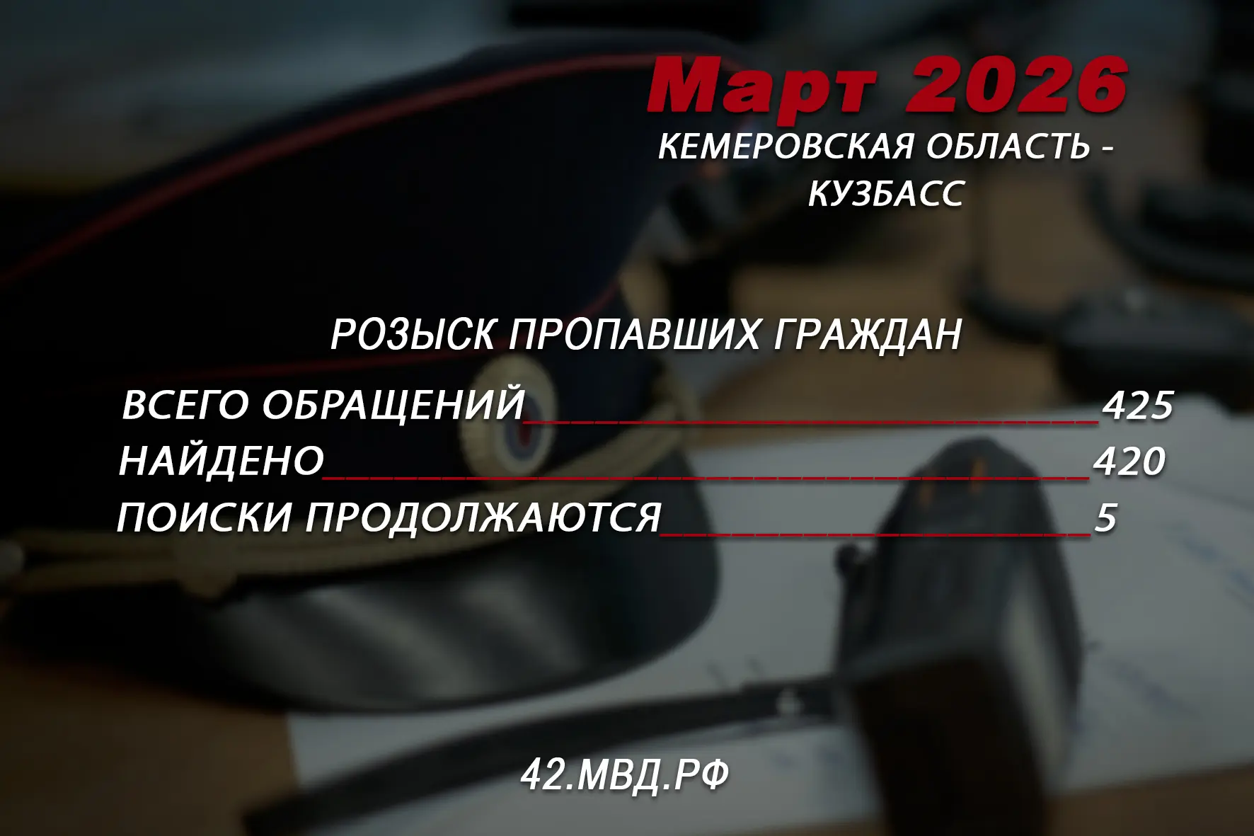 По данным управления уголовного розыска ГУ МВД России по Кемеровской области – Кузбассу, в марте 2026 года в розыске находились 425 человек, 420 из них найдены сотрудниками полиции, в том числе при содействии граждан. Поиски 5 человек продолжаются.