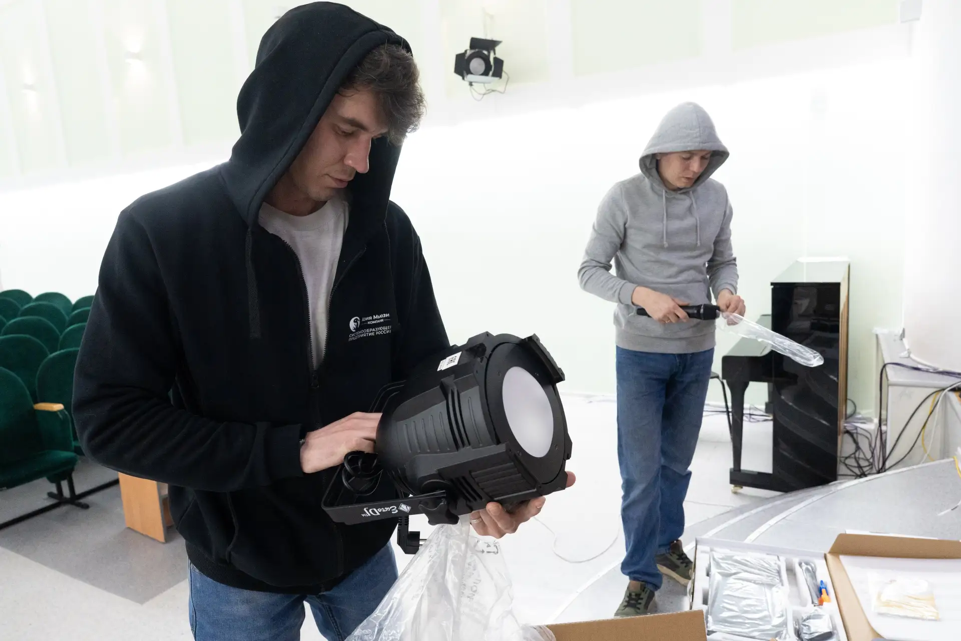 Радио-, аудио-, акустические системы, микшерный пульт, прожекторы, сценические мониторы, сабвуферы и все необходимые к ним комплектующие – всего около сорока наименований. Оборудование в актовый зал только завезли, теперь специалисты будут заниматься установкой и подключением. А первое мероприятие, которое состоится здесь на совершенно ином уровне – это отчётные мероприятия, на которые всегда приглашают родителей учащихся. Техническое оснащение позволит выступления сделать яркими, современными, подчеркнуть важные моменты, создать необходимую атмосферу.