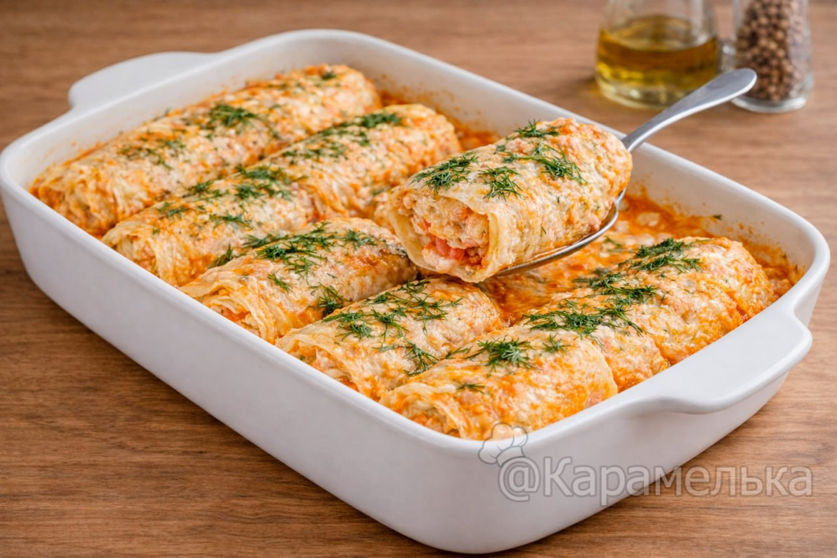 Эти блюдо отличается сочностью и мягкостью. Нежные капустные листья хорошо пропитываются томатно-сметанным соусом, создавая неповторимый вкус. Кроме того, открытые края капусты придают блюду особый вид.