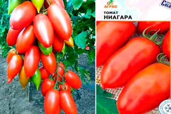 Кусты Ниагары имеют индетерминантный тип — могут достигать до 2 метров в высоту, с зелеными листьями стандартной формы. Плоды, весом от 90 до 100 граммов, имеют прелестную красную окраску и гладкую кожицу. В одной кисти созревает от 10 до 14 помидоров.