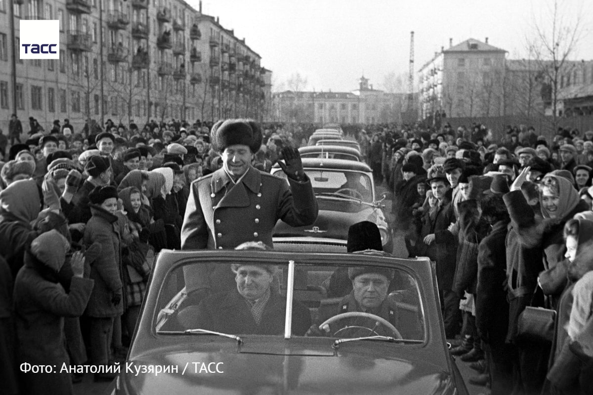 На фото Леонов (в автомобиле на втором плане) во время проезда кортежа по улицам Кемерова, 1965 год.
