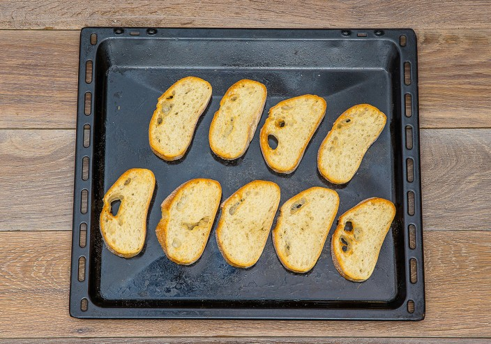 Шаг 1: Разогреть духовой шкаф до 180°С. Нарезать чиабатту на ломтики толщиной 1 см и положить на противень. Выпекать в течение 5 минут до золотистого цвета.