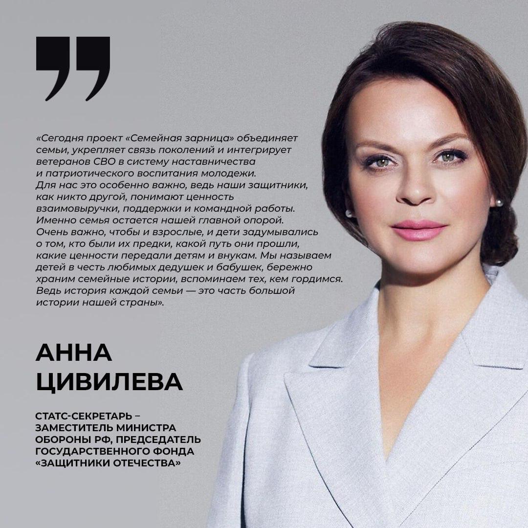 «Семейная зарница объединяет семьи и укрепляет связь поколений», — отметила статс-секретарь — заместитель министра обороны РФ, председатель фонда «Защитники Отечества» Анна Цивилева.