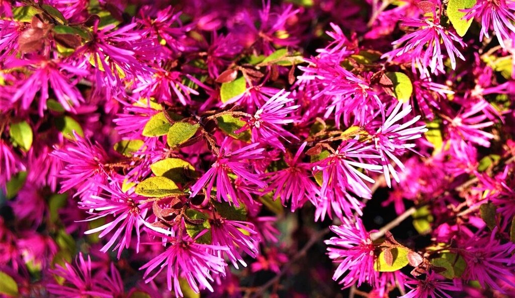 Лоропеталум, который также называют деревом шелковых лент, получил свое название благодаря оригинальным соцветиям, похожим на яркие ленточки, собранные в густые пучки. Это вечнозеленый кустарник с красивыми листьями большинства сортов, которые в зимний период не опадают. Листья могут быть темно-пурпурными, но встречаются и сорта с ярко-зеленой кроной.