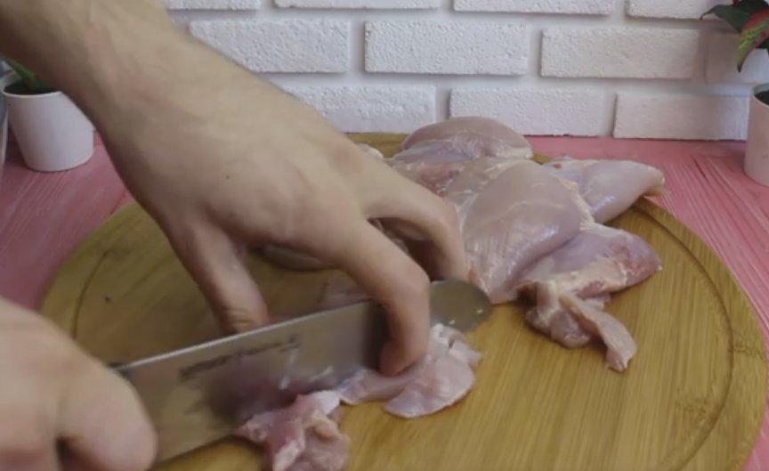 Первый шаг — подготовка куриного мяса. Предпочтительно использовать бедрышки: они более сочные и нежные, чем грудка. Удалите кожу и кости, затем нарежьте мясо кубиками или прокрутите через мясорубку для удобства.