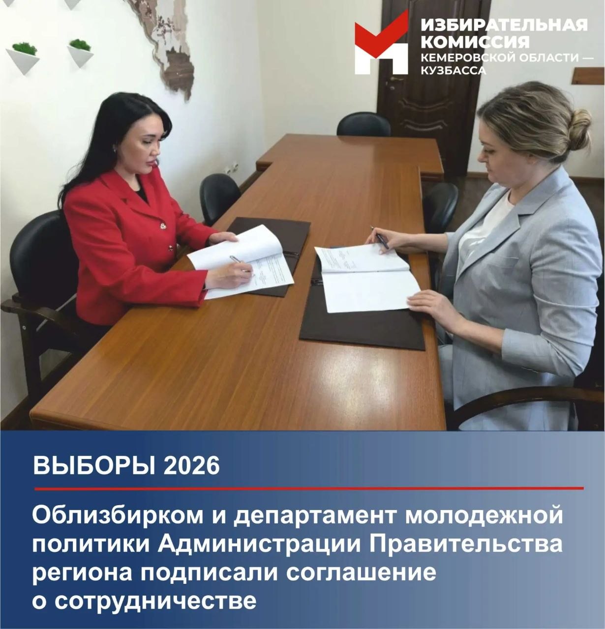 Избирательная комиссия Кузбасса и департамент молодежной политики Администрации Правительства региона подписали соглашение о сотрудничестве. Документ скрепили подписями Светлана Демидова и Анастасия Путинцева.