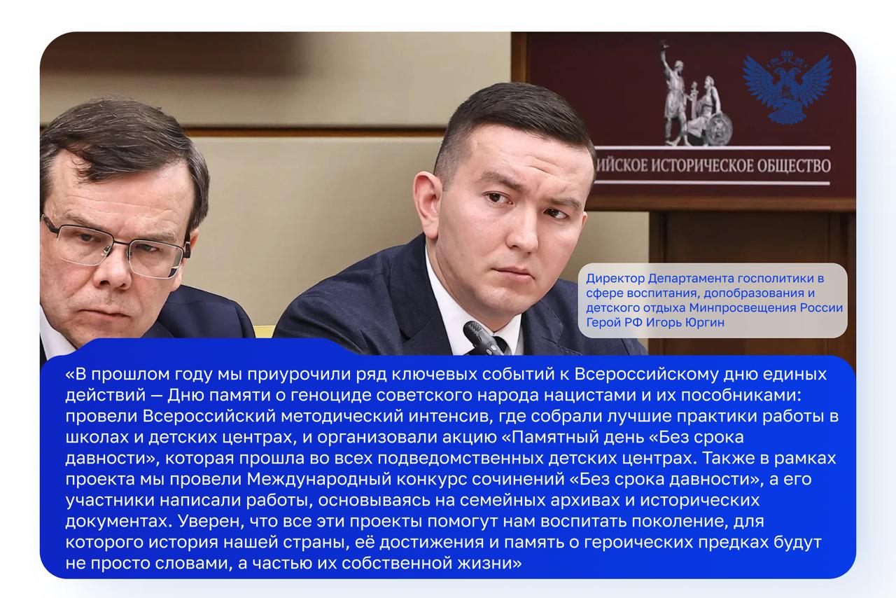 В ходе заседания директор Департамента госполитики в сфере воспитания, допобразования и детского отдыха Минпросвещения России Герой РФ Игорь Юргин сообщил о современных форматах исторического просвещения и мероприятиях по формированию патриотических ценностей.