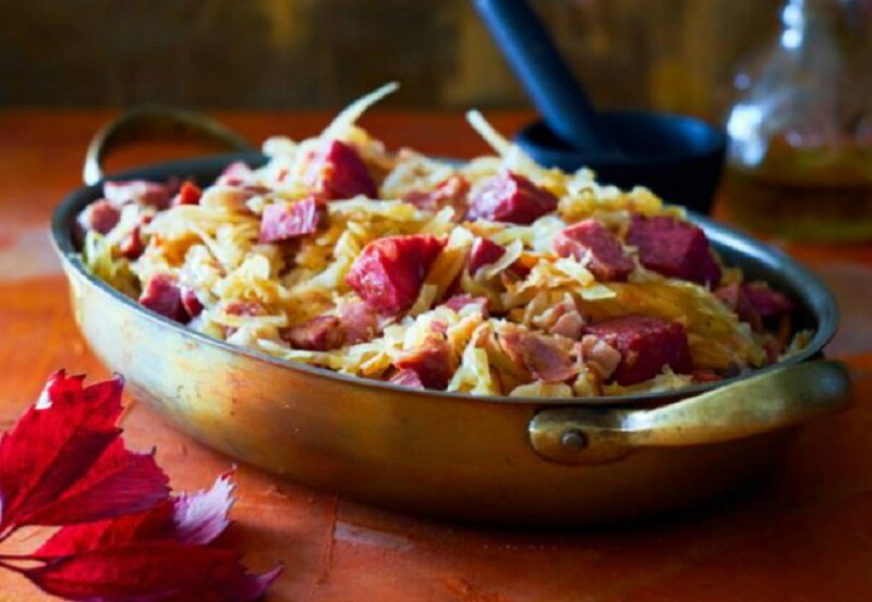 Далее пришла пора квашеной или маринованной капусты. Промойте её, отожмите и нарежьте, чтобы кусочки не были слишком длинными. Перемешайте капусту с луком на сковороде, накройте крышкой и тушите на среднем огне, время от времени помешивая.