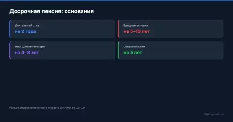 Существует множество оснований для досрочного выхода на пенсию. Вот основные категории: