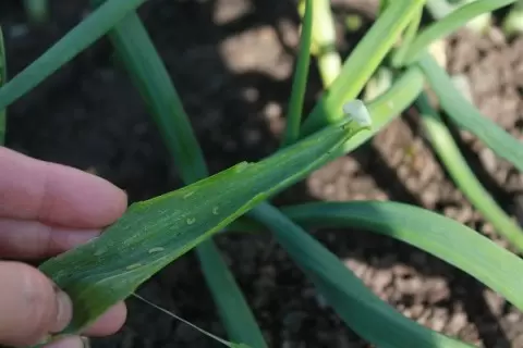 Яйца вредителя обычно откладываются в укромные места: в пазухах лука или даже на земле рядом с растениями. Эти крошечные яйца легко пропустить, что делает защиту еще более важной.