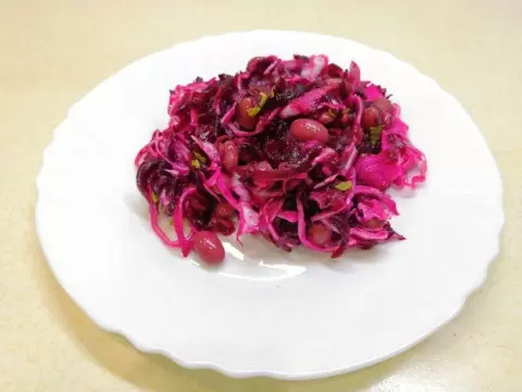 Квашеную капусту, которую можно купить в магазине, необходимо добавить в натертую свеклу. Консервированную фасоль нужно тщательно промыть под проточной водой, чтобы избавиться от лишнего натрия. Все ингредиенты смешиваются в одной емкости.