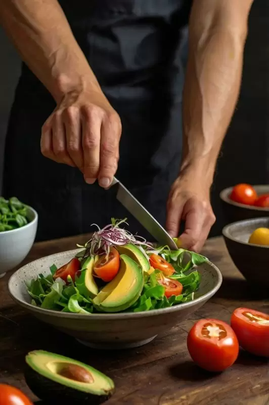 В завершение, по вашему вкусу добавляется немного соли, перца и свежей зелени. В качестве заправки используется растительное масло — всего 10 г. После этого всё аккуратно перемешивается.