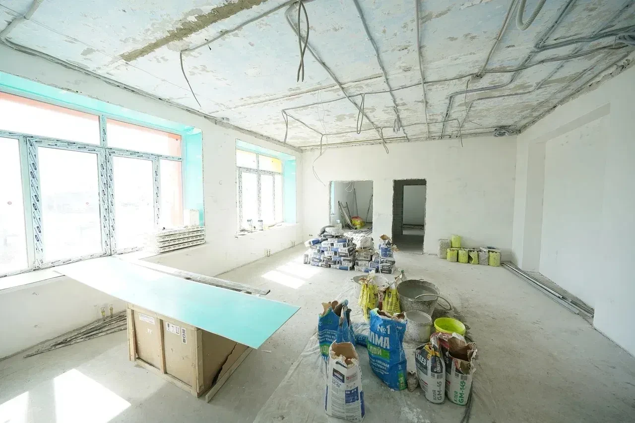 Готова новая кровля, заменены все окна, сети. Заканчивается внутренняя отделка. Когда потеплеет, начнут благоустраивать территорию.