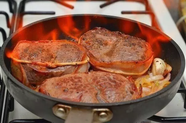 Заключительным аккордом станет брызгание ромом или коньяком и поджигание, что добавит особого шика и уникального вкуса. После прогорения алкоголя медальоны следует переместить на решетку.