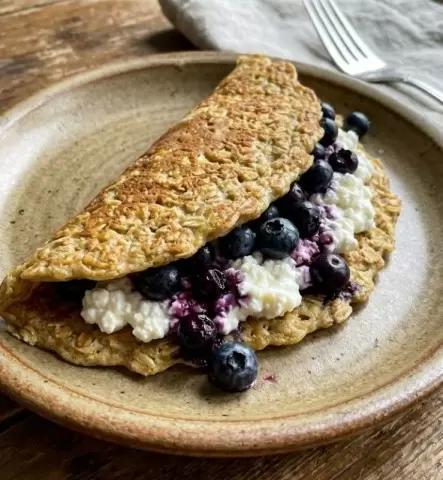 Приготовление: Смешать овсяные хлопья с яйцом и молоком, дать постоять 5 минут, засунуть на сковороду. Внутрь поместить творог с подсластителем и ягоды.