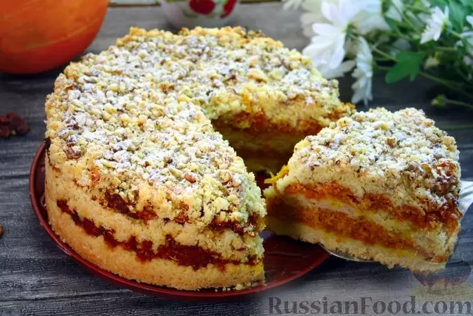 Процесс приготовления не займет много времени. Сначала муку и манку следует смешать с сахаром и маслом, а затем уложить в форму слоями. Тыквенная начинка укладывается поверх, завершая выпечку посыпкой из орехов.