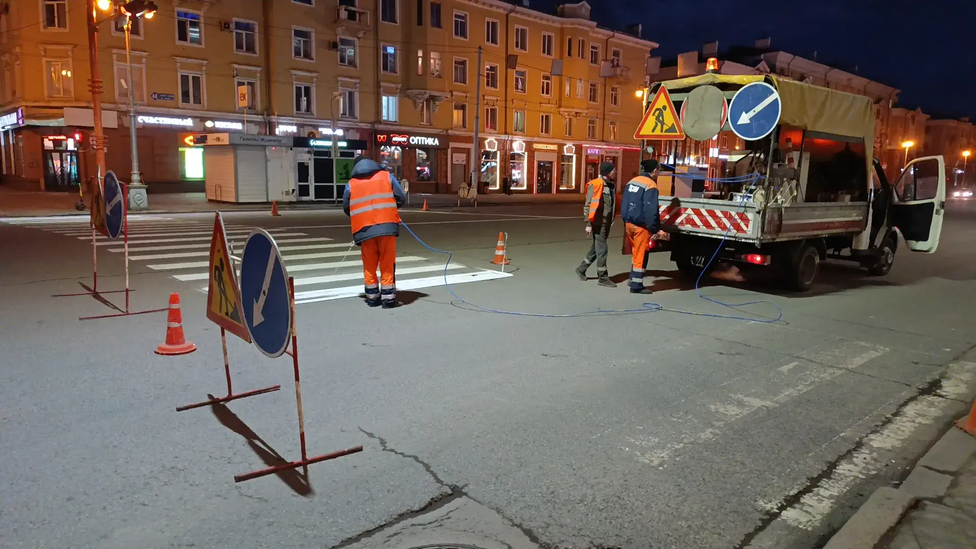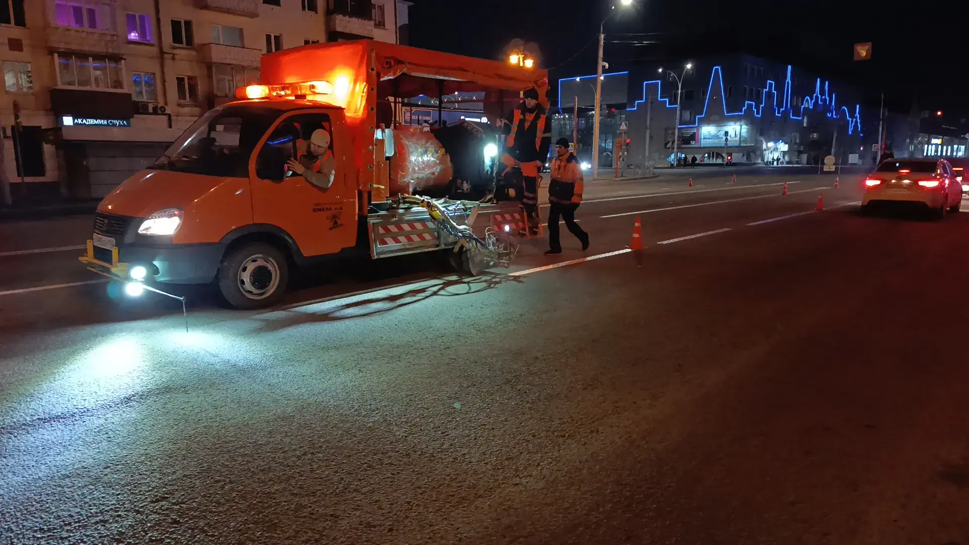 В ночное время специалисты наносили дорожную разметку на Советском проспекте.