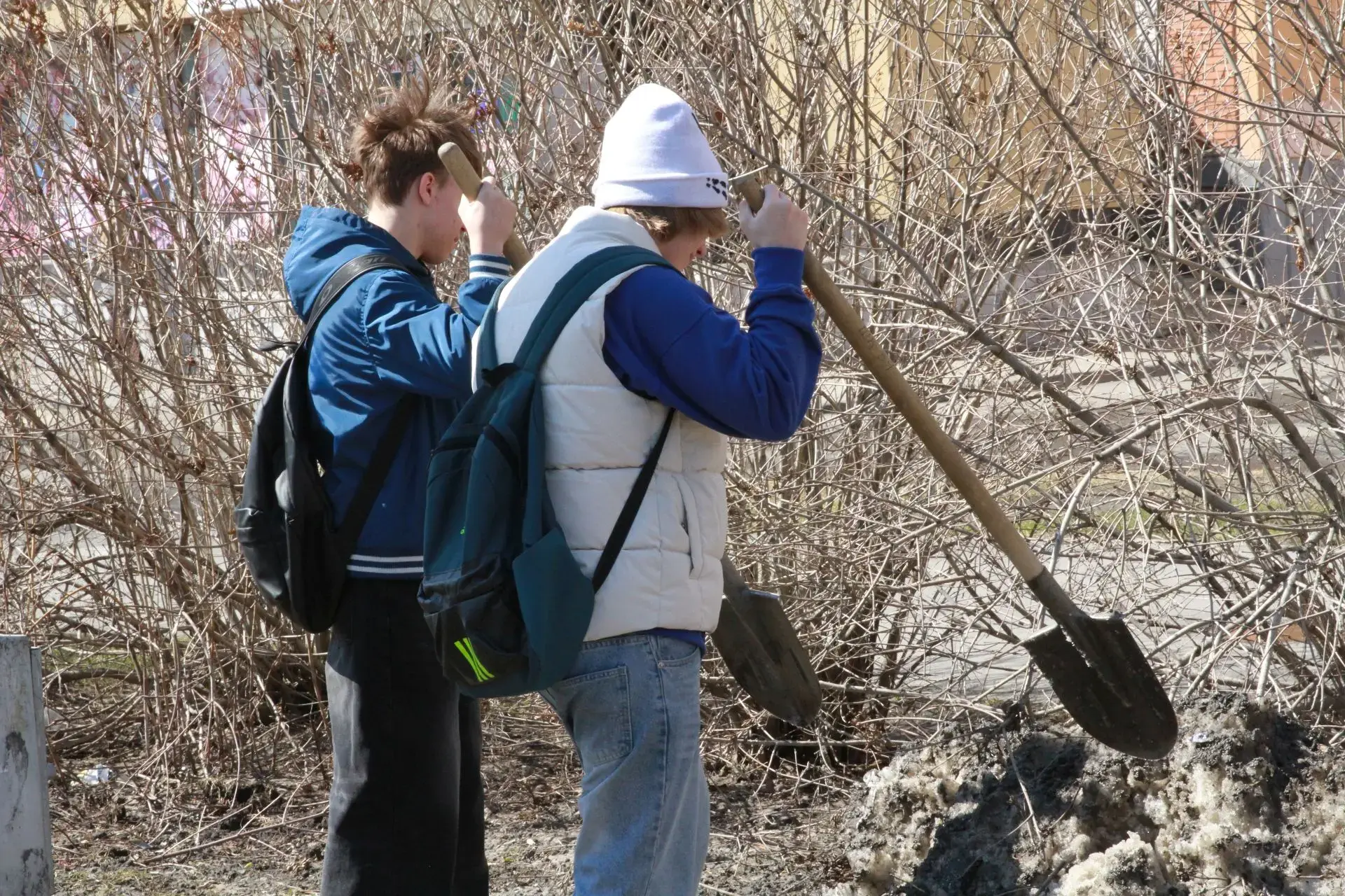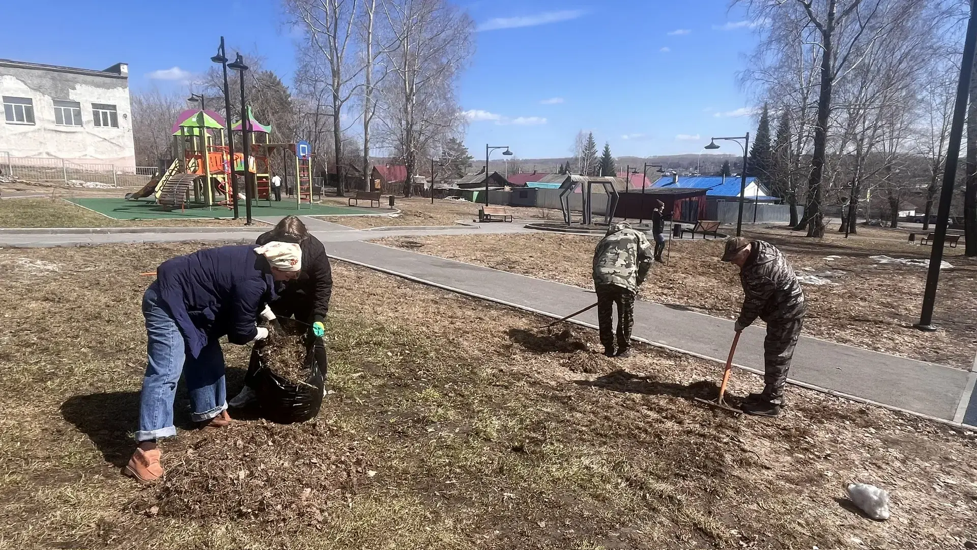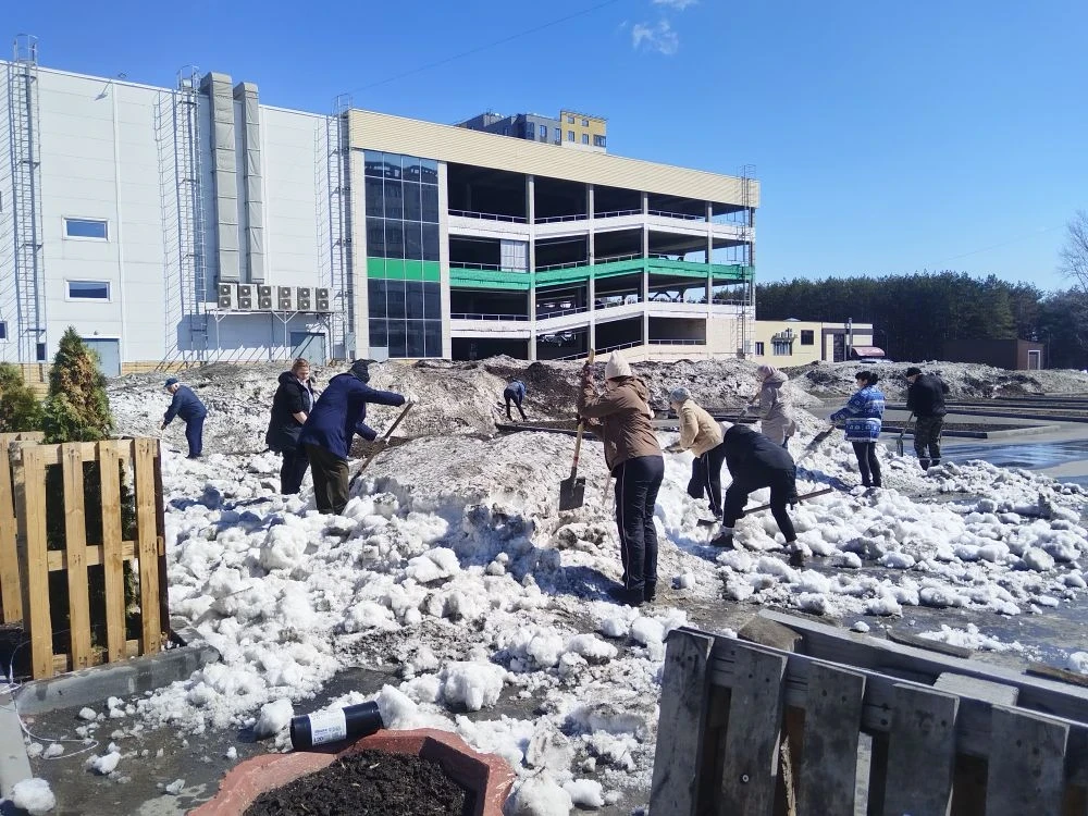 Жители разворошили оставшийся снег, собрали мусор, побелили деревья и обновили краску на урнах.