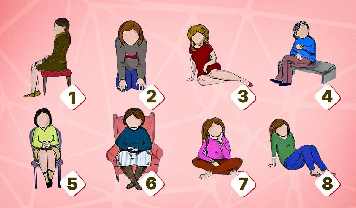 Представьте, что перед вами восемь различных поз для сидения. Какую из них вы выбрали бы? Ниже приведены описания и типичные черты личности в зависимости от вашего выбора.