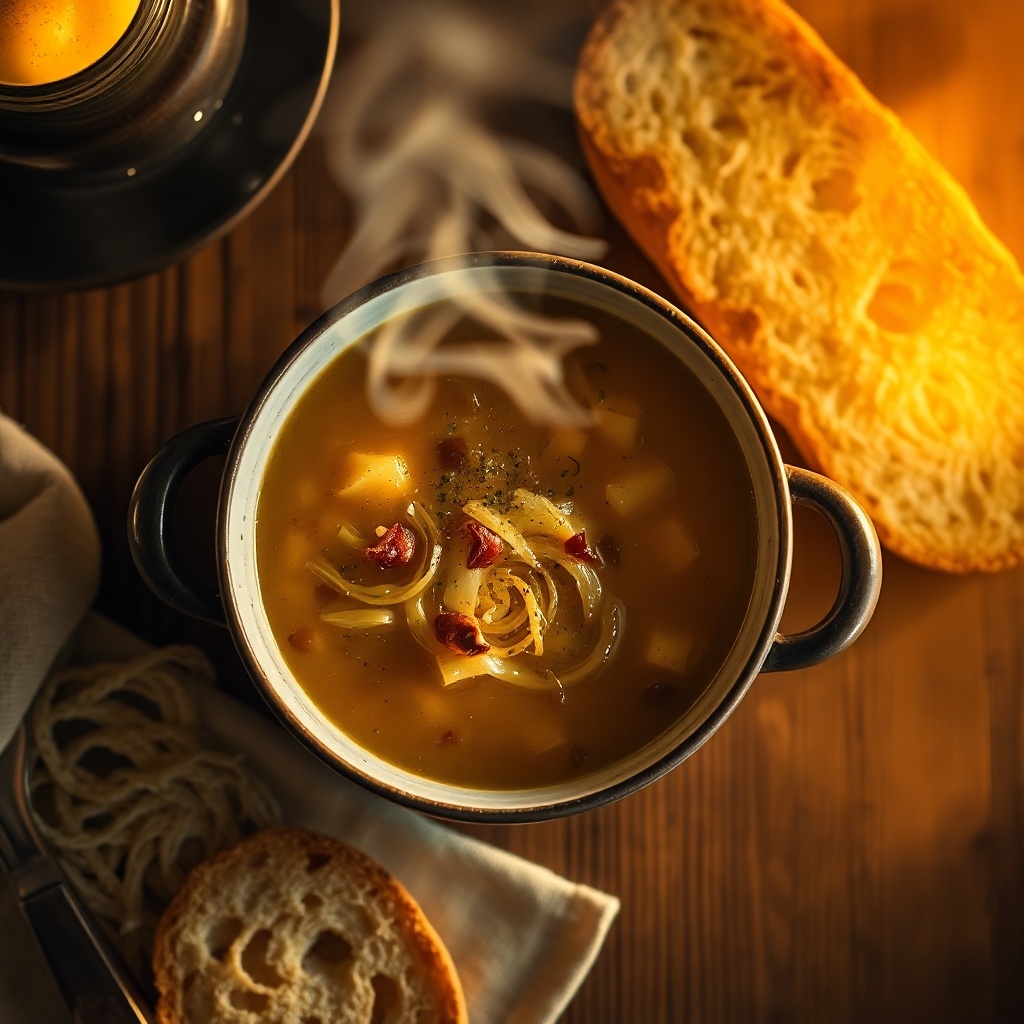 - Французский луковый суп: Этот изысканный суп, приготовленный из карамелизованного лука и ароматного бульона, обогатит ваш стол. Для его создания понадобятся репчатый лук, сливочное и оливковое масла, а также белое вино.