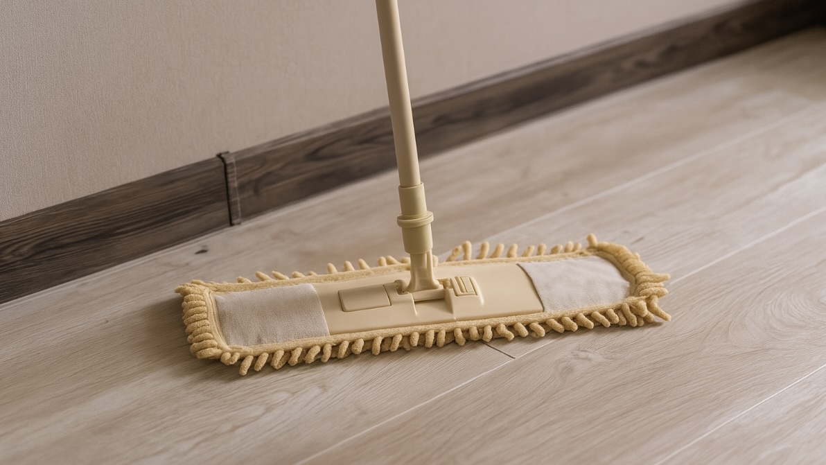 - Паркет и деревянные полы: Эти покрытия страдают от соли, которая проникает в древесину, разрушая её изнутри. Перед уборкой тщательно соберите максимально возможное количество соли и реагентов с поверхности. Здесь подойдёт пылесос с мягкой щеткой — это поможет избежать царапин. Затем приготовьте водно-уксусный раствор (соотношение 1:10) и аккуратно протрите пол. Не забудьте в конце протереть чистой тряпочкой.